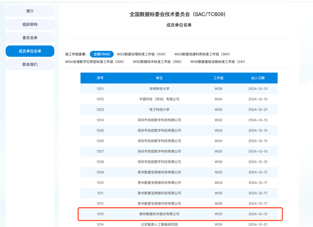 近日,全國數據標準化技術委員會(簡稱“全國數標委”)(SAC/TC609)官網正式公布成員單位名單。美林數據技術股份有限公司成功入選全國數據標準化技術委員會,成為WG2數據治理標準工作組首批成員單位。