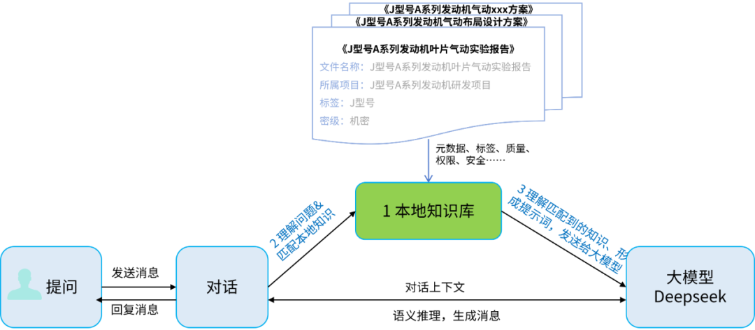 當用戶提出問題(如“J型號A系列發動機葉片的進氣參數設計值是多少”)時,系統首先需要理解問題的語義,并在本地知識庫中檢索相關的知識(如“J型號A系列發動機”“葉片”“進氣參數”“設計值”等關鍵詞)。