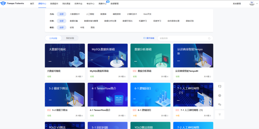 課程實驗旨在通過實踐操作來加深學生對理論知識的理解,并培養他們的實踐技能和解決問題的能力。TT平臺圍繞高校的人才培養目標,以及大數據領域專業人才能力需求,打造包含數據采集、數據存儲、數據分析、數據應用等上千個覆蓋大數據領域技術知識點的課程實驗。課程體系豐富多樣,從入門、熟練到精通應用的落實,專業系統的課程設計讓學生將每一個知識點吃透和掌握,全面培養學生應用能力,提升綜合數據素養。