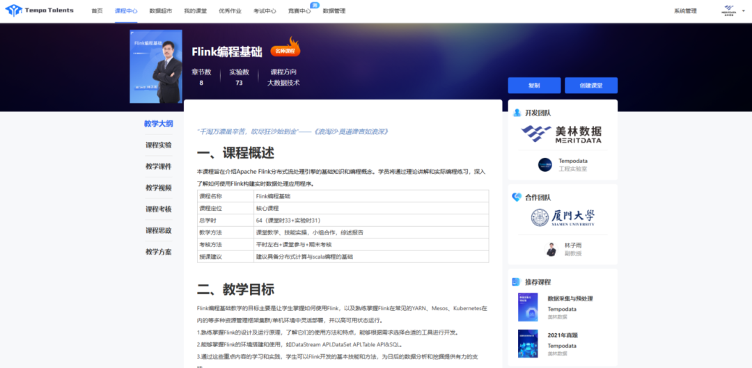 以【Flink編程基礎】為例,該課程是美林數據聯合教學名師—廈門大學林子雨老師,共同打造的專業課程,包含完整的教學大綱以及配套的課程實驗、教學課件、教學視頻、課程考核、課程思政、教案等資源。