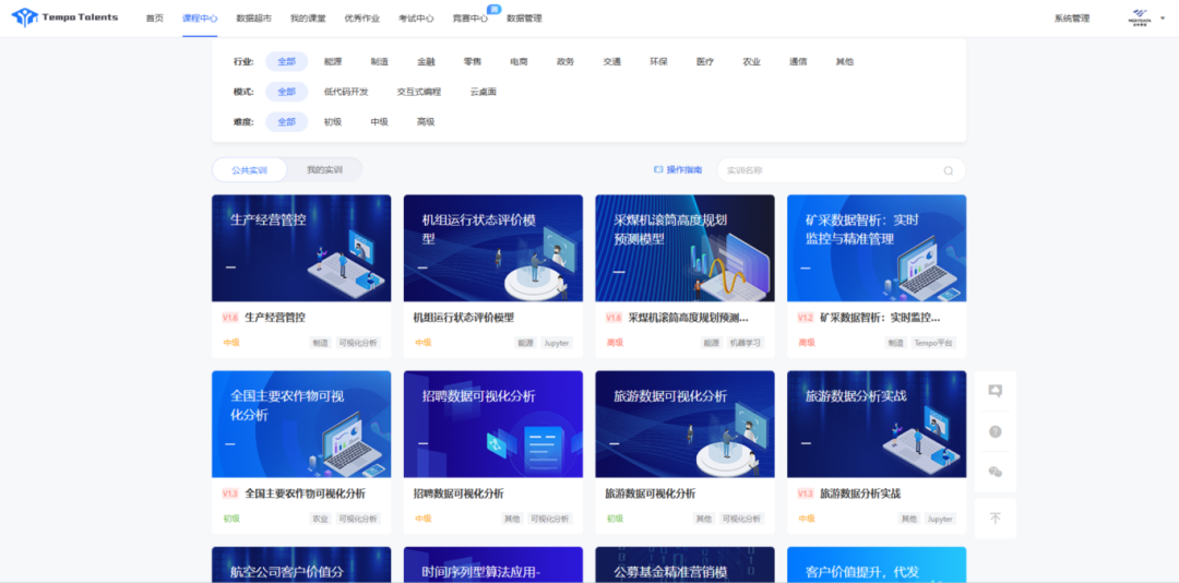 應用實訓案例覆蓋了能源、制造、金融、零售、電商等多個行業,支持低代碼開發、交互式編程、云桌面等多種的實驗模式,為不同方向、不同學科的學生提供了大數據實踐機會,使他們在實際操作中深化理論知識,提升技能水平。