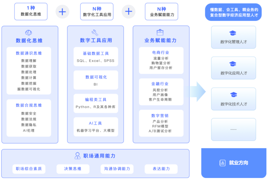 美林數據旨在培養具備扎實的經濟學知識、管理學基礎,具有數據思維,又能熟練運用現代數字化工具技術,掌握數字資源處理方法,熟悉我國數字經濟運行規律與改革實踐,能夠勝任政府機構及企事業單位數字經濟工作,適應地方經濟建設和社會發展的高素質復合型應用人才。緊密結合市場需求,注重學生綜合素質和實踐能力的培養,確保畢業生能夠在數字經濟領域迅速適應并發揮重要作用。