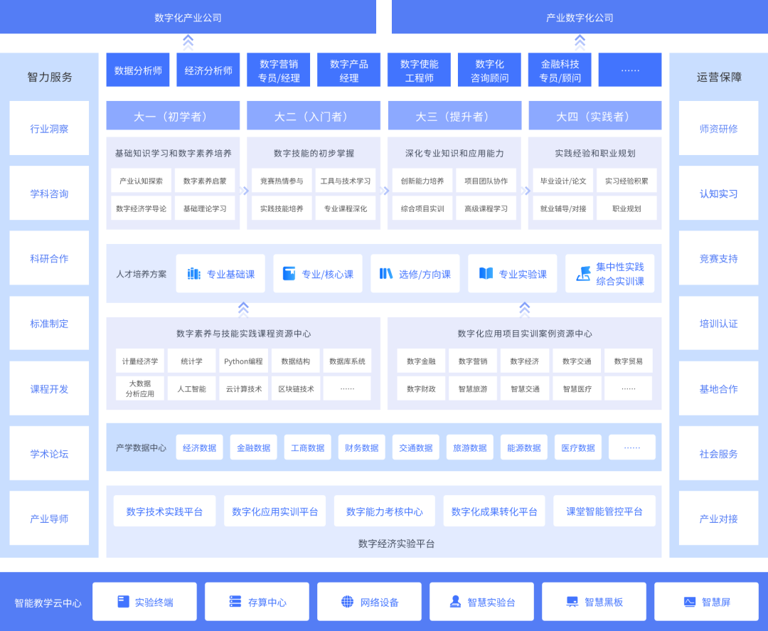 基于產業崗位需求、高校教學理論、行業人才標準和國家職業技術技能標準,美林數據融合大數據、人工智能、云計算、區塊鏈等前沿技術知識,借助產業數字轉型實踐與技術支撐,設計了一套覆蓋數字化應用項目全流程應用技術的課程體系。注重專業知識、專業融合實踐和新技術實踐、創新實踐的有機銜接,從整體上提升學生數字素養、數字技能、數字化應用能力,提高就業質量。